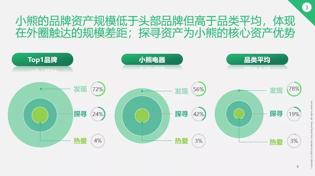与传统领先的头部品牌相比,小家电品牌小熊的品牌资产规模正处于上升期,且已经高于品类平均值,并在探寻资产的占比上有明显的优势。