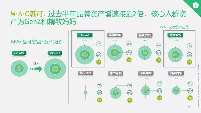 M·A·C魅可的做法围绕“扩大目标群体,做大外圈层”展开,把本次新品的营销核心瞄准了GenZ和精致妈妈,而一波组合拳下来,还最大限度的实现现有目标群体,其品牌资产规模在彩妆品类中保持前5,并且在2019年6月-12月品牌资产规模提升约1.9倍。