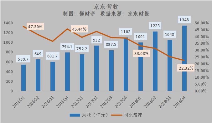 其次从营收上看,京东单季度营收增速持续放缓,屡创新低。数据显示,2018Q4 京东的营收增速仅为 22.32%。另外,京东从 2016 年二季度后,便开始用净营收这一概念替代原来的营收数据与增速。