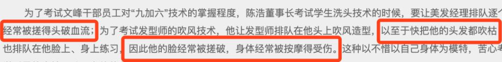 不光教学,他还会亲自当模特,据官网介绍,在考试的时候,陈浩会让美发经理挨个给他洗头,最后头都洗秃噜皮了,轮流给他吹干造型,把头发都吹枯了。