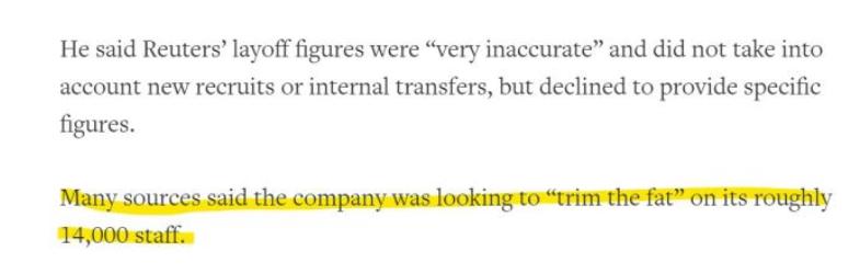 此前 " 裁员 14000 人 " 的乌龙,也逐渐平息。