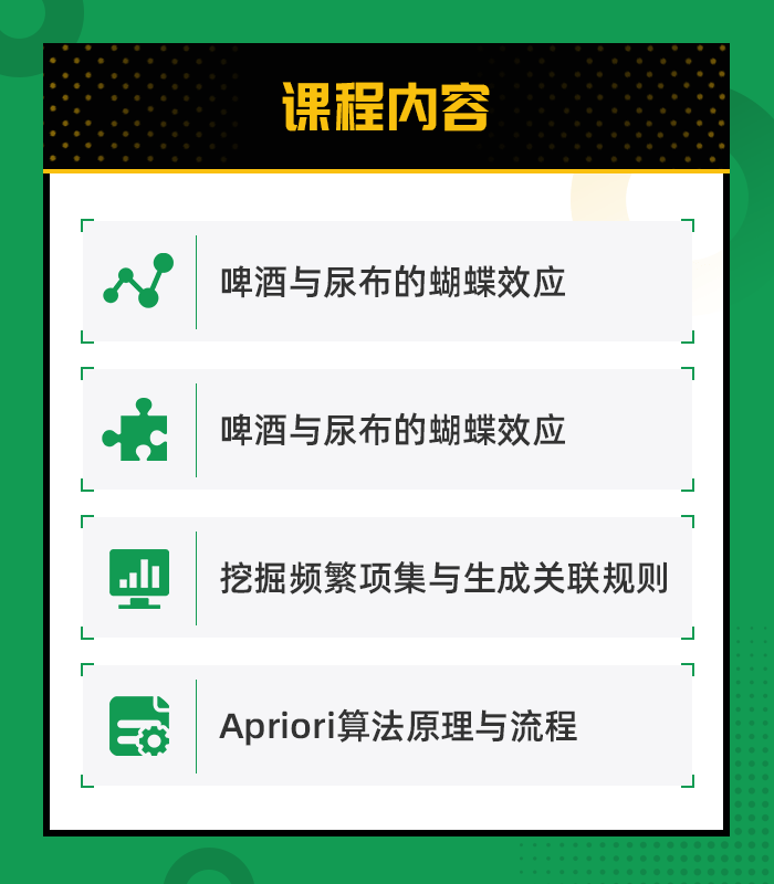 此次公开课主讲数据分析中关联分析、时序分析及情感分析的应用,涉及Apriori算法,并通过不同案例帮大家迅速掌握各类算法,提升求职面试通过率。
