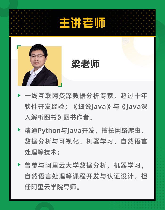 此次公开课邀请了有多年一线互联网数据分析经验的梁勇老师授课,他曾担任阿里云导师并参与了数据分析、机器学习等课程开发和认证设计。