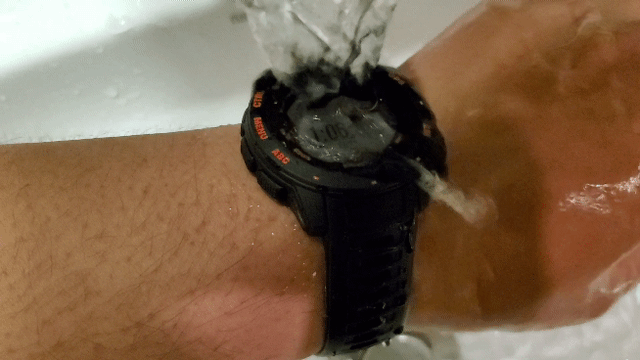 Instinct Esports本能电竞版支持军规级耐热、抗冲击、和防水,其防水等级为10ATM,即水下100米防水。胖胖通过冲水实验后发现,即使是泡在水池里也毫无压力,用水清洗手表更是不必说了。