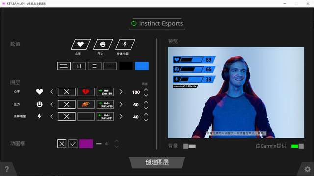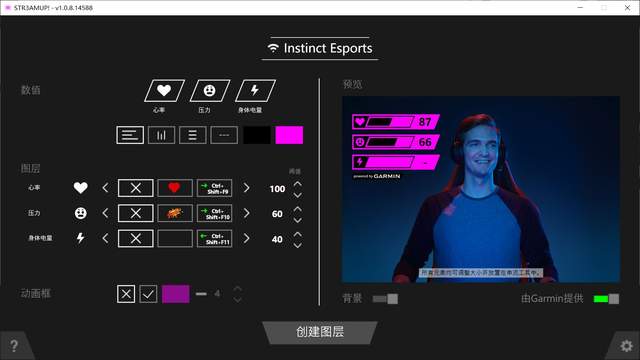了解了这三大关键参数,接下来我们便来看看Instinct Esports本能电竞版的双软件应用,即手机App Garmin Connect和PC端软件STR3AM UP!,其中STR3AM UP!可以将电竞模式下手表监测到的实时心率、压力值、和身体电量数据实时显示在游戏直播界面上,帮助专业级电竞选手和普通玩家监测身体状况的同时,也带来了全新的游戏体验。