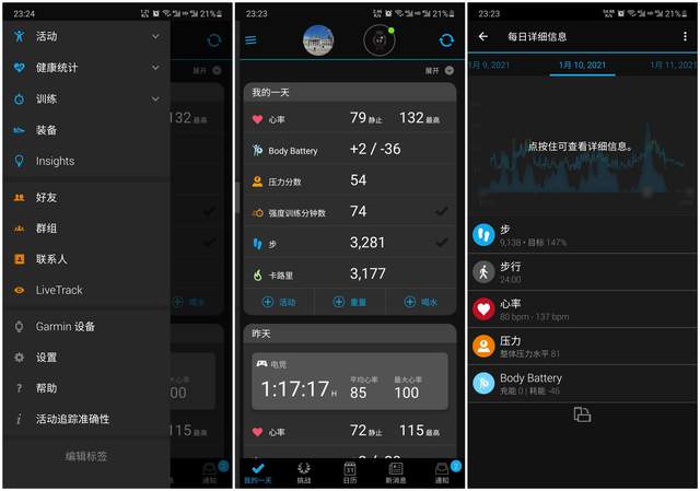 而Body Battery身体电量则是由心率变异、压力、睡眠和活动等多方面综合得出身体能量储备情况,帮助分配一天内的活动和休息,合理优化体能。