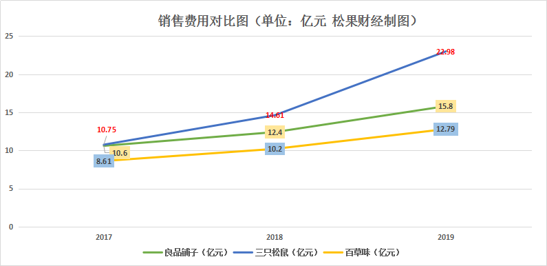 在销售费用上,2017年—2019年,三只松鼠分别为10.75亿、14.61亿及22.98亿;良品铺子分别为10.6亿、12.4亿及15.8亿;百草味分别为8.61亿、10.2亿及12.79亿。