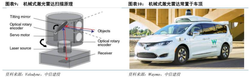 其中,机械式激光雷达通过电机带动光机结构整体 360 度旋转,是激光雷达最经典且发展最为成熟的机械架构;但是其缺陷在于价格昂贵、体积较大(通常安置于车顶)且机械部件寿命较短,因此难以通过车规,主要于 RoboTaxi/RoboTruck 场景上应用。