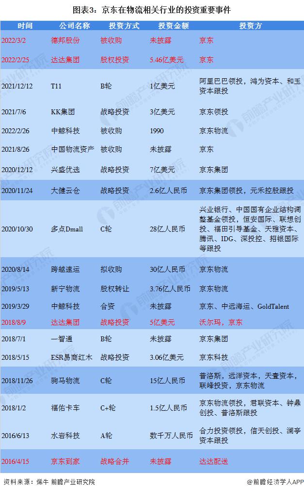 注:较深的蓝色底为京东在物流产业链中游的投资并购事件,红色字体的则为本次 " 京邦达 " 事件主角的相关事件。