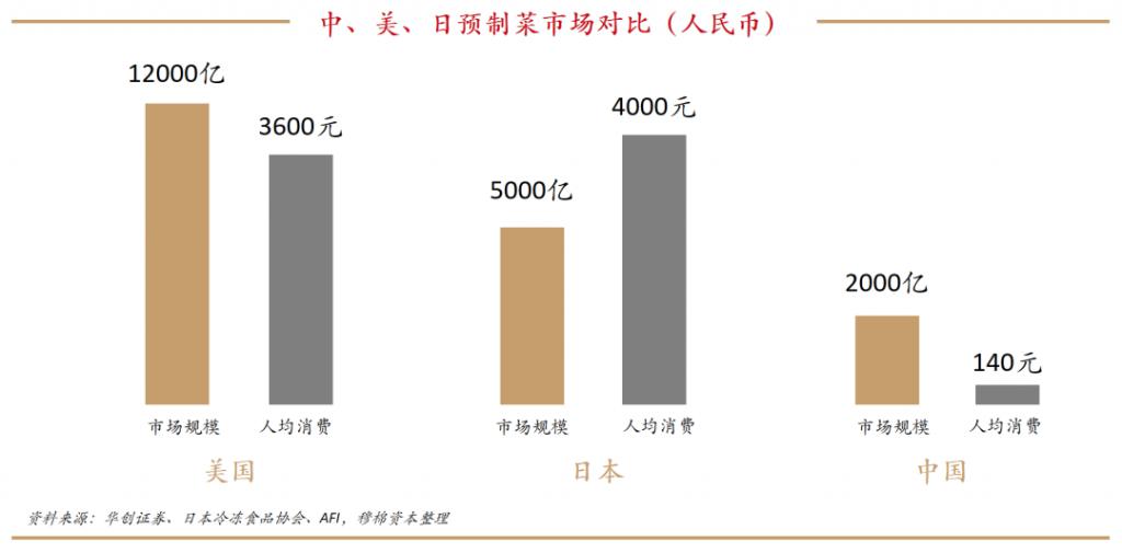 2020 年美国市场规模约在 2000 亿美元(1.2 万亿元),日本市场规模约为 9.8 万亿日元(5000 亿元),当前中国预制菜行业市场规模约为美国的六分之一、日本的三分之一。