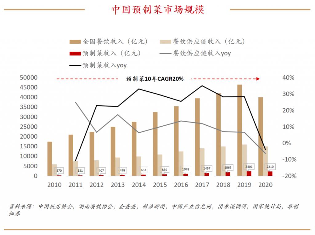 根据华创证券研报显示,2020 年我国预制菜市场规模已达 2310 亿元,2010-2020 年复合增长率高达 20%,未来十年有望达到近万亿元规模。