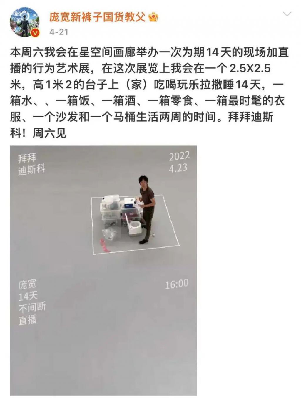 4 月 21 日,庞宽发了条微博,说自己将在北京 798 艺术园区开启一场直播,带了五箱子行李:水一箱、自热米饭一箱、酒一箱、零食一箱和时髦衣服一箱。然后,他要在 2.5 m×2.5 m 的高台上生活 14 天。