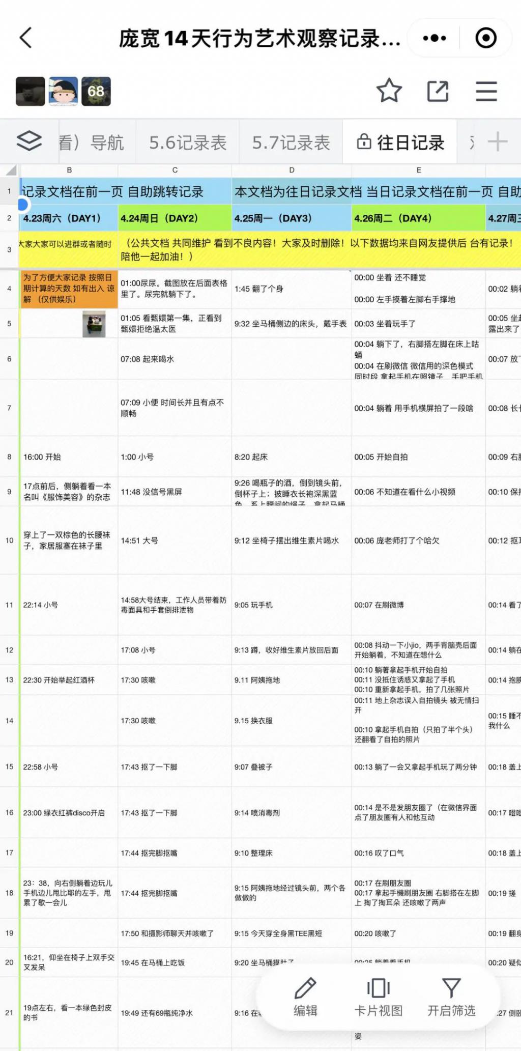 比庞宽更行为艺术的是,有人建了一个共享文档记录他这 14 天的生活,细致到打嗝、放屁、抠脚。