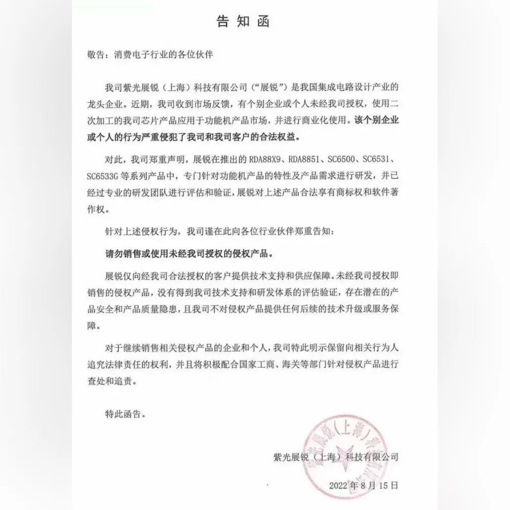 函中提到,某些商家或个人在未经展锐同意的情况下,将二次加工的展锐芯片放到功能机上。