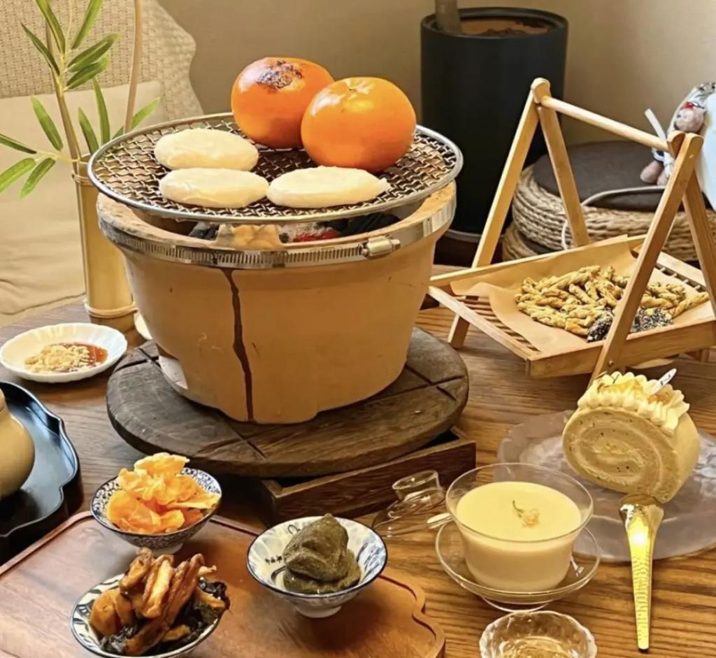 目前虽然还没一家标准连锁化的围炉煮茶店打出名号,但是打开这些新中式茶馆的菜单,发现它们都是相似的,一般标配都是 128~238 元 / 人,含围炉烤茶的茶位费加烤六样(年糕、橘子、红薯、花生、板栗、瓜子之类)。
