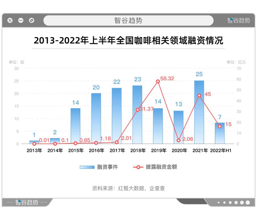 进入 2022 年后,现磨咖啡赛道的融资热潮依旧在持续。截至 2022 年 6 月,上半年现磨咖啡赛道融资事件共计 6 起,披露融资金额超过 14 亿元。