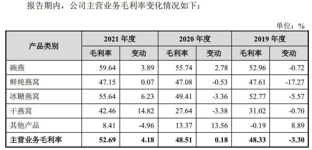 值得注意的是,燕之屋的燕窝产品毛利率其实很高,2019年-2021年的主营业务毛利率分别为48.33%、48.51%以及52.69%。其中碗燕产品的毛利率甚至高达60%。