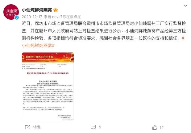 2020年7月,知名打假人士王海发文质疑小仙炖的“干燕窝含量5克及以上”、“0添加”以及“固形物含量大于等于90%”三大核心卖点存在虚假宣传的问题。