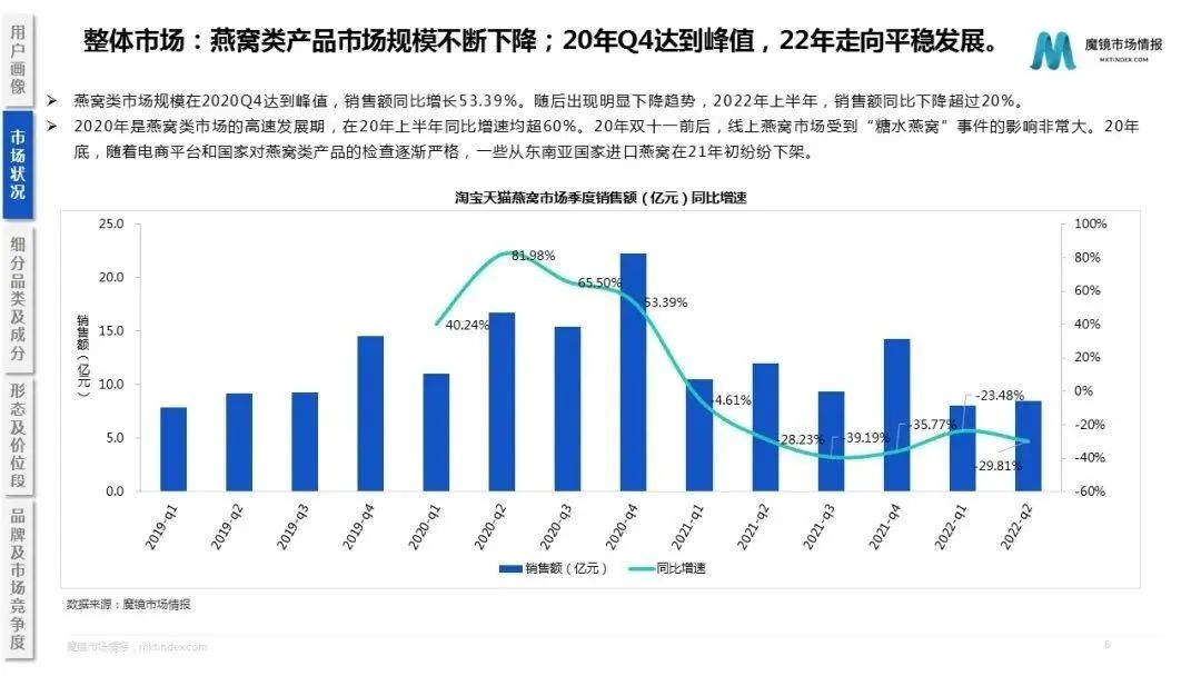 魔镜市场情报统计的数据显示,2020年Q4,中国线上燕窝市场规模达到了超20亿元的峰值,此后就节节下探,2022年上半年,销售额同比下降超20%。
