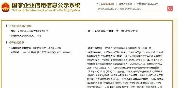 2021年5月,因存在使用原材料、生产产地与宣传不符、生产资质虚假等虚假宣传行为,北京市朝阳区市场监督管理局对小仙炖处以20万元罚款。