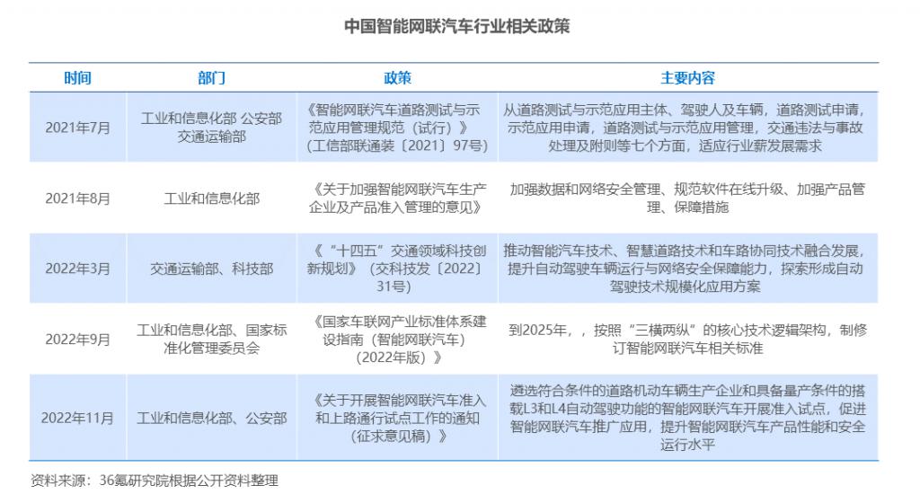 得益于系列政策支持,我国智能网联汽车在整车制造、信息通信、道路交通等多领域创新发展,产业生态日益丰富。近年来,一方面,国家各部门持续出台各类政策,覆盖智能网联汽车行业的顶层目标提出、规范制定和核心技术发展等多角度,建立与行业高速发展相匹配的政策环境;另一方面,鼓励智能网联汽车落地应用,驱动其规模化发展,为行业繁荣发展指明方向。2022 年 11 月,工业和信息化部和公安部联合发布《关于开展智能网联汽车准入和上路通行试点工作的通知(征求意见稿)》,期望建立试点,为未来定制完善的智能网联汽车生产准入和道路交通安全管理体系积累管理经验。这表明国家期望扩大智能网联汽车试点范围,加快其商业化落地,形成健全的行业管理体系。