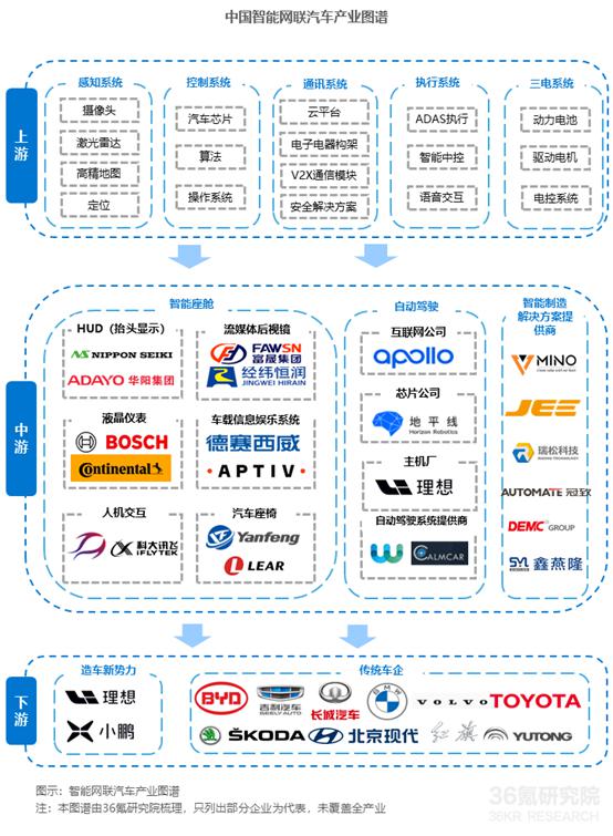 产业生态:由上游关键系统、中游智能座舱、自动驾驶和智能制造、下游整车制造厂商组成