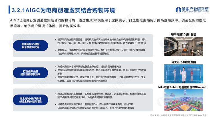 AIGC 让电商行业创造虚实结合的购物环境,通过 3D 模型用于虚拟展示、打造虚拟主播用于提高直播效率、创造全新的虚拟展览等,给予用户沉浸式体验、提升购买效率。