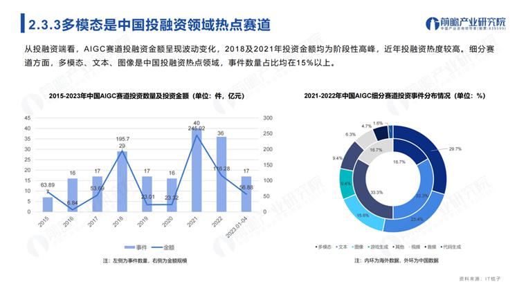 《报告》指出,从投融资端看,AIGC 赛道投融资金金额呈现波动变化,2018 及 2021 年投资金额均为阶段性高峰,近年投融资热度较高。细分赛道方面,多模态、文本、图像是中国投融资热点领域,事件数量占比均在 15% 以上。