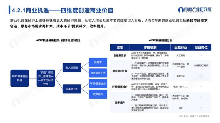 《报告》指出,商业机遇在经济上往往意味着更大的经济效益,从收入增长及成本节约维度切入分析,AIGC 带来的商业机遇包括新的市场需求创造、原有市场需求再扩大、成本环节/ 要素减少、效率提升。