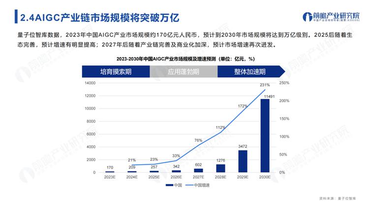 《报告》显示,2023 年中国 AIGC 产业规模约 170 亿元人民币,预计到 2030 年市场规模将达到万亿级别。2025 年后随着生态完善,预计增速有明显提高;2027 年后随着产业链完善及商业化加深,预计市场增速再次迸发。