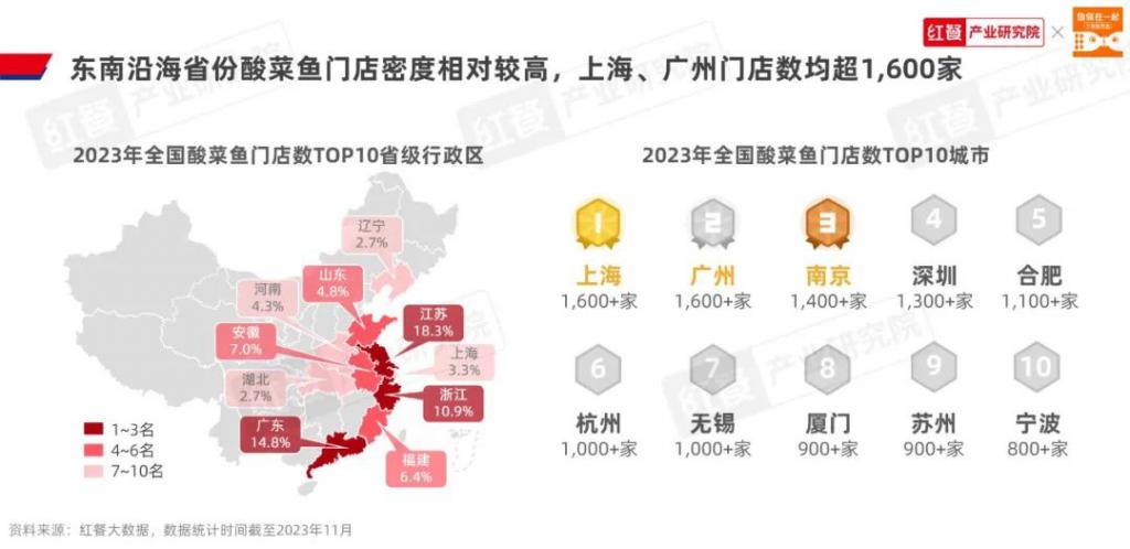 同时,酸菜鱼门店还呈现出区域分布不均衡的特点。据红餐大数据,52.4% 的酸菜鱼门店分布于华东区域;其次为华南区域,门店数占比达到 17.9%;其他区域的酸菜鱼门店相对较少。