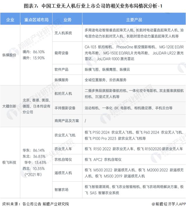 从我国工业无人机行业代表性企业的业务布局情况来看,纵横股份的业务产品较为全面,产品链条广,涉及无人机系统、载荷设备、软件产品等 ; 大疆的无人机以航拍无人机为主,开发二摄多焦段旗舰影像航拍机、一体化空中电影机、双主摄准旗舰航拍机、沉浸式无人机等多种无人机产品。极飞科技的工业无人机产品主要聚焦在农业板块,目前其业务已经从农业无人飞机衍生至农业无人车、农机自驾仪、遥感无人机、智慧农场等。