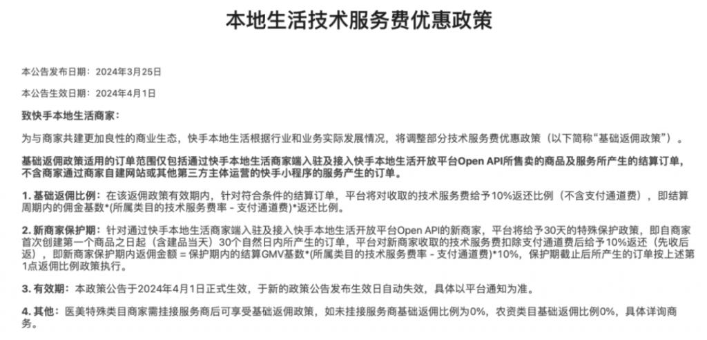 此外,在技术服务费方面,快手只收取 1-2% 的费率外,在 2023 年 7 月开始按照 60% 的比例向符合标准的商家返还技术服务费,2024 年 4 月 1 日起返还比例下降到了 10%。