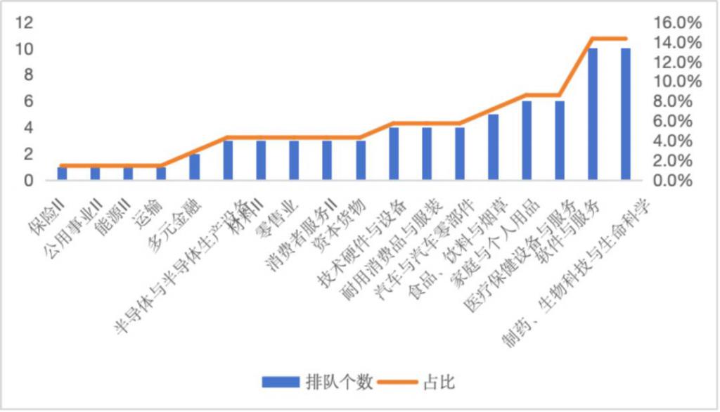 从行业分布上来看,上市企业中,软件与服务行业占比最多,达到了 40%;而聆讯排队企业中,医药行业占比最多,此外,软件服务、食饮、半导体、汽车及零部件也占据了较大的份额。
