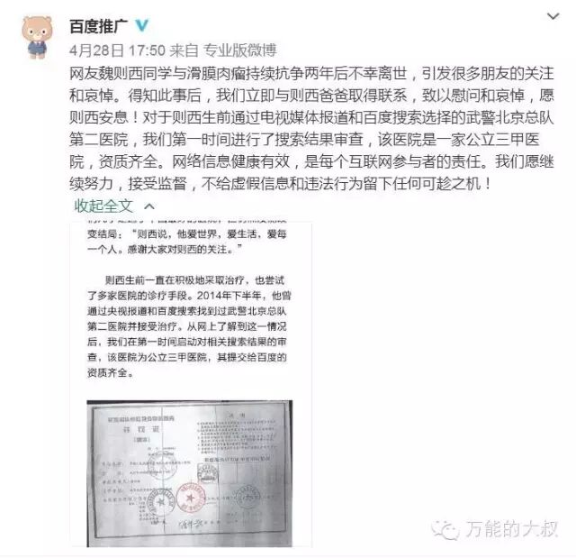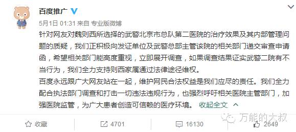 三、5月1日,百度再次回应此事,避而不谈其广告模式问题,转而将问题核心指向医院的管理问题。百度称其正积极向发证单位及武警总部主管该院的相关部门递交审查申请函,希望相关部门能高度重视,立即展开调查,如果调查结果证实武警二院有不当行为,百度全力支持则西家属通过法律途径维权。
