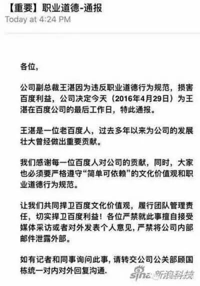 二、次日,一封百度内部邮件在网上流传,该邮件声称公司副总裁王湛因违反职业道德行为规范、损害公司利益被辞退。由于此消息并无官方出来证实,虽然无法得知其真实性,但从侧面可以看出,这可能是百度在为此事问责。
