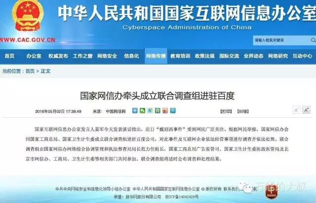 2、5月2日下午,国家网信办已牵头成立联合调查组进驻百度。