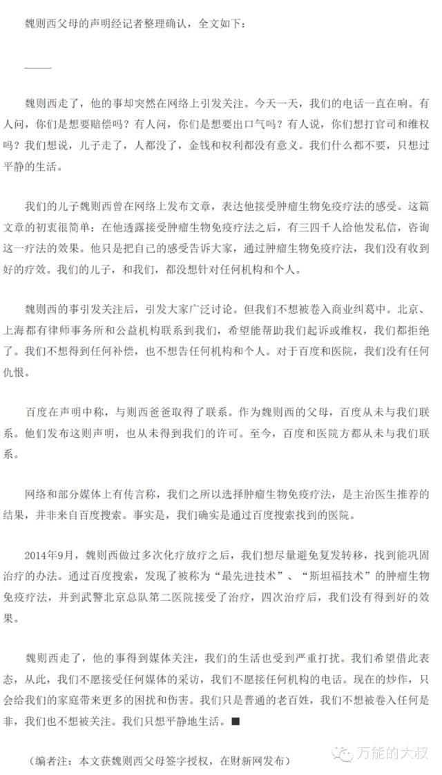 大叔建议大家仔细看一下魏则西父母的这份声明,全文如下: