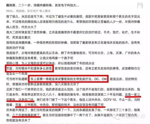 事件的起因是身患滑膜肉瘤的西安电子科技大学21岁学生魏则西的过世,其在知乎上求助并一路诉说自己身心煎熬的治疗路程时提及百度。