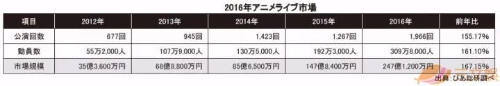 2016年,“Love Live”μ's的演唱会,水树奈奈的场次动员了55,000人。“偶像大师”的“THE IDOLM@STER CINDERELLA GIRLS-4thLIVE-TtiCastle STORY”灰姑娘计划动员了22,000人。此外,除了蓝井艾露、i☆RIS、苍井翔太等单独出道的动漫系艺人,多人团体出演的动漫歌曲演唱会也多了起来。