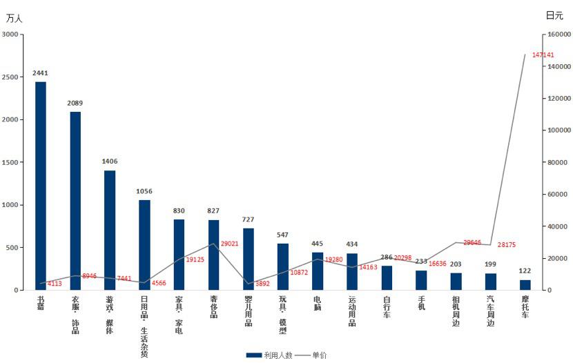 图 3:日本各类二手商品服务利用人数以及平均单价。数据来源:《リユース市場規模調査》,日本环境省环境再生 · 资源循环局总务课资源循环利用推進室。图表为钛媒体驻日研究员整理。