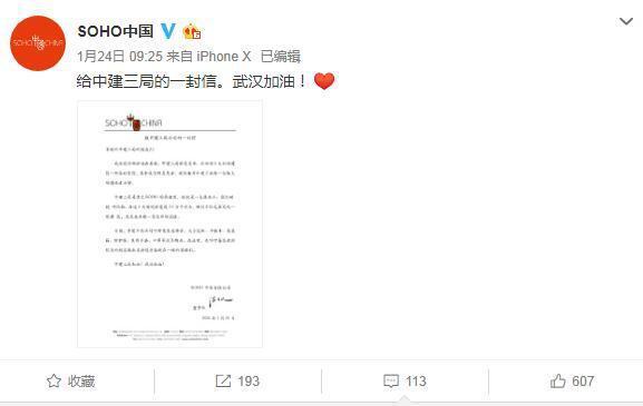 这条蹭热点对象,是盖“二神山”医院的中建三局,也是古北SOHO的承建商,并对其一顿夸赞。此后,在自己2000万粉丝的微博上,也只是喊喊加油。