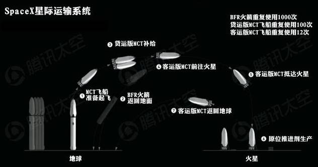 所以,马斯克拿出了解决方案,一套叫做叫做 “ Space X 星际运输系统 ”的玩意儿 ,最大程度的补给了飞船飞行过程中对燃料和物品的需求,过程是酱紫滴~