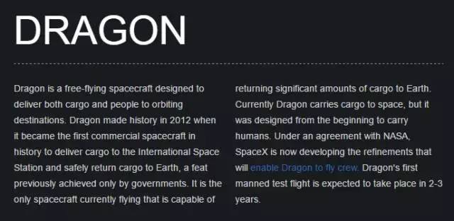 所以,在Space X ,这哥单独立了一个项目,取了个很洋气的名字,叫做—— “ Dragon(龙) ”,简介如下——