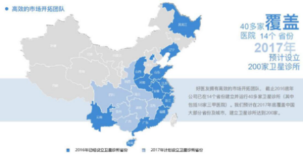 其二就是对中国三甲医院资源的整合。该集团已与国内众多知名、顶尖医疗机构合作,诊所网点已顺利入驻华北地区、华东地区、华南地区的40多家医院,均为省级及地市级龙头。