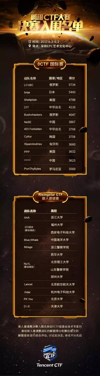 其中,来自俄罗斯的LC↯BC战队、来自日本的binja战队和来自美国的Shellphish战队分别获得TCTF国际赛(0CTF)线上预赛冠亚季军,此外还有来自美国的PPP战队、来自匈牙利的传统CTF强队!SpamAndHex、复旦大学******战队以及来自宝岛台湾的217战队等国际知名战队都将在国际赛(0CTF)决赛中展开激烈比拼,一同争夺直通拉斯维加斯的资格。