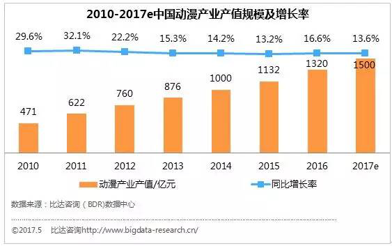 2015年,我国动漫产业发展迎来了“爆点”与“拐点”,二次元用户强大的反哺能力影响了影院的排片量,可以看到,过去的一两年中,国产动画数量有了快速增长,有数据表明,2017年动漫行业产值将达1500亿各大视频网站纷纷加入二次元领域,想在动画市场分一杯羹。