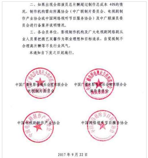 今日,中国广播电影电视社会组织联合会电视制片委员会、中国广播电影电视社会组织联合会演员委员会、中国电视剧制作产业协会、中国网络视听节目服务协会联合发布《关于电视剧网络剧制作成本配置比例的意见》。其中提出了三点内容,主要针对明星天价片酬。