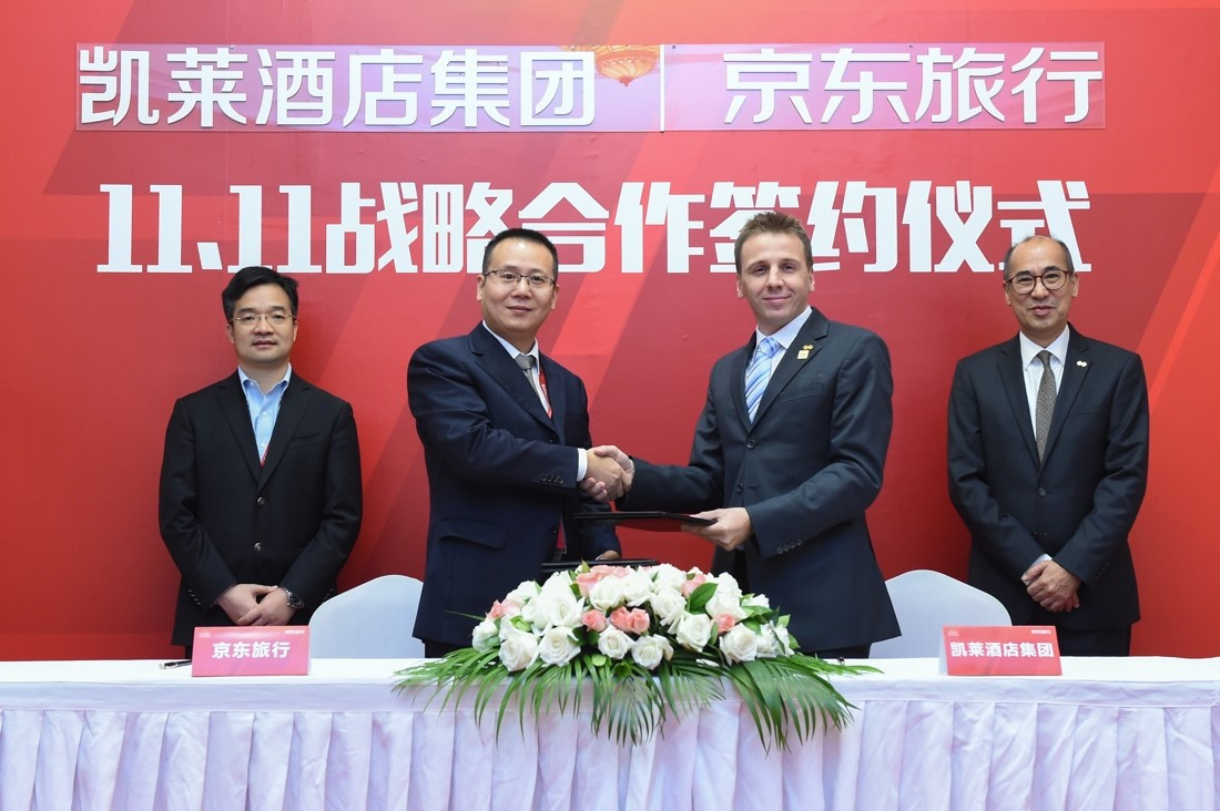 (京东集团副总裁、3C文旅事业部总裁胡胜利、京东生活旅行业务总经理孙峰与凯莱酒店集团运作副总裁朱家辉、凯莱酒店集团品牌总监托马斯出席签约)