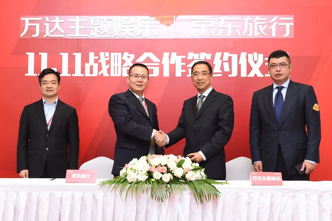 (京东集团副总裁、3C文旅事业部总裁胡胜利、京东生活旅行业务总经理孙峰与万达文旅集团副总裁兼主题娱乐公司执行总裁沈嘉颖、万达主题娱乐公司销售部总经理张晓君出席签约)